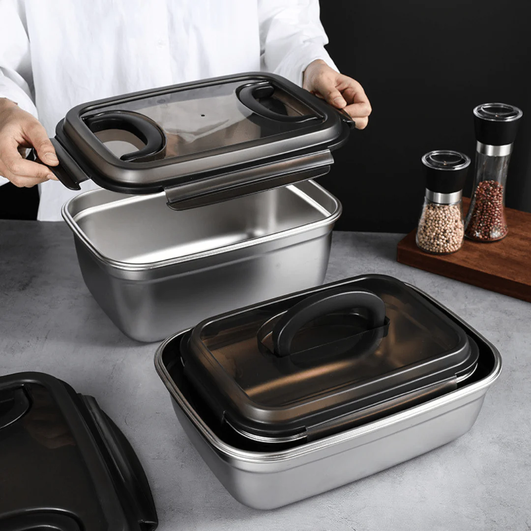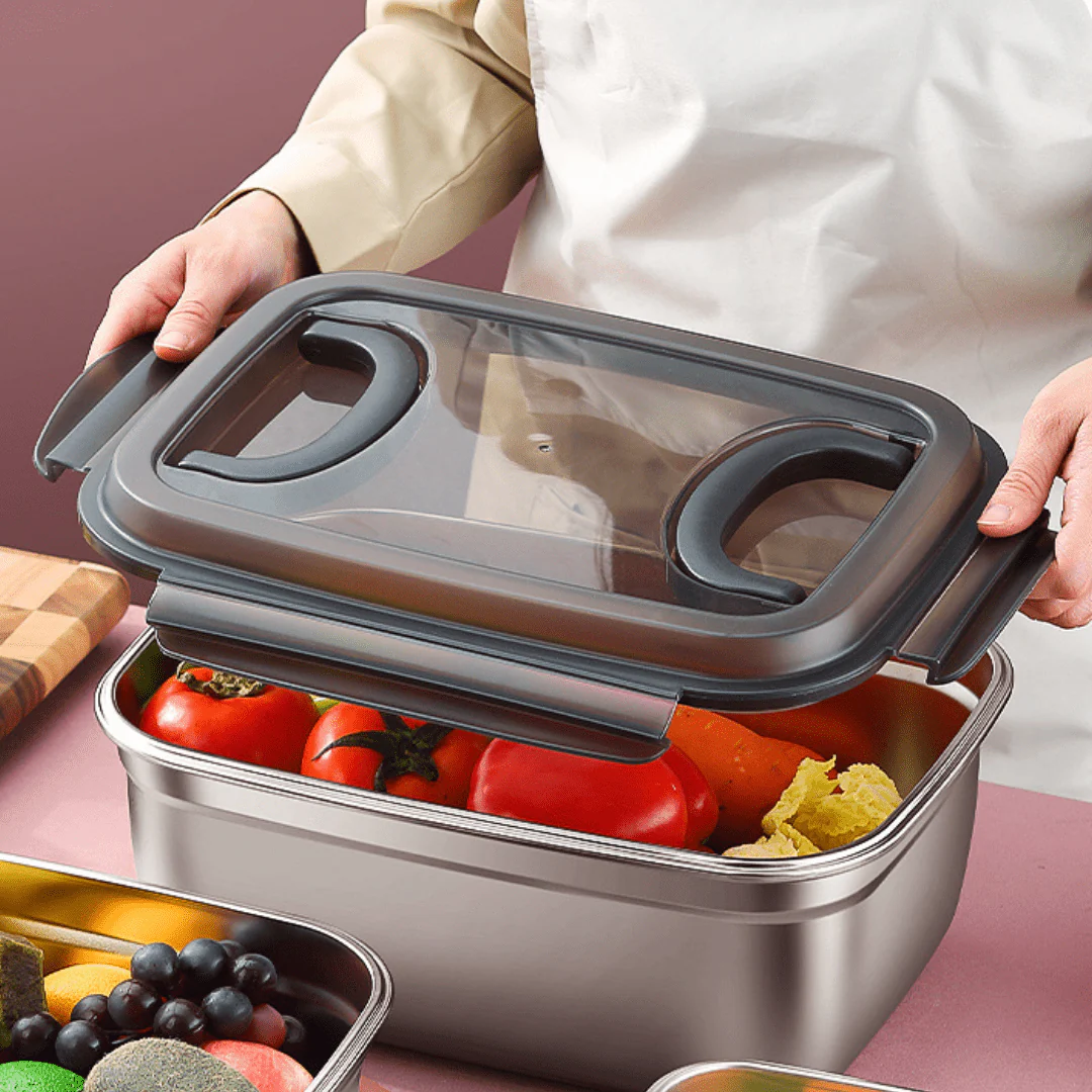 This high-quality stainless steel fresh-keeping box ensures long-lasting food preservation. Designed with a leak-proof silicone seal and secure four-sided buckles, it prevents spills and maintains freshness. The translucent lid allows easy visibility of stored items, while the large-capacity design provides ample storage. Perfect for refrigerator storage, meal prep, and daily kitchen use.