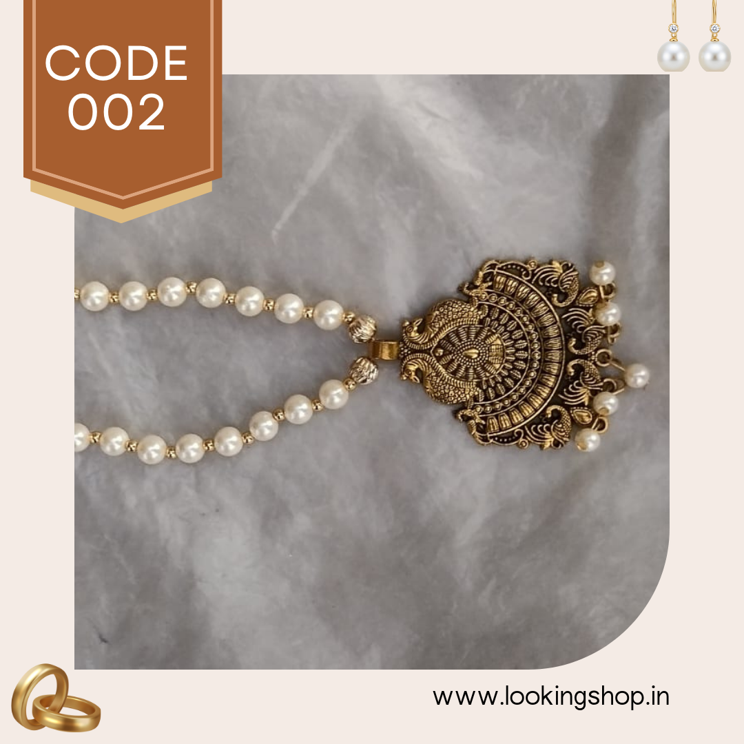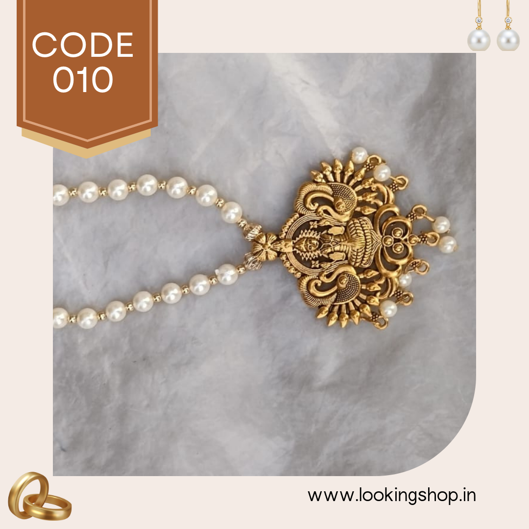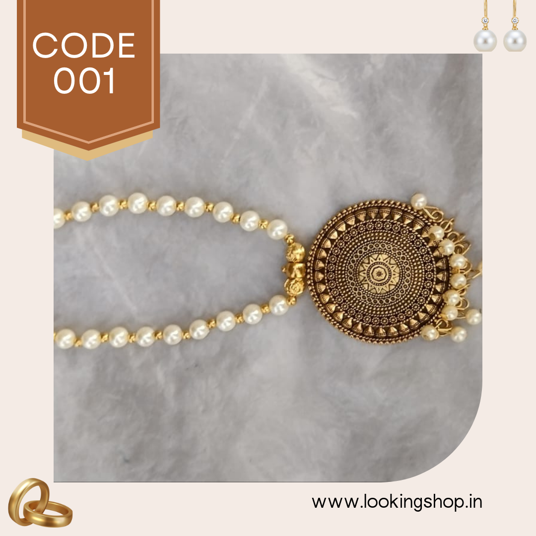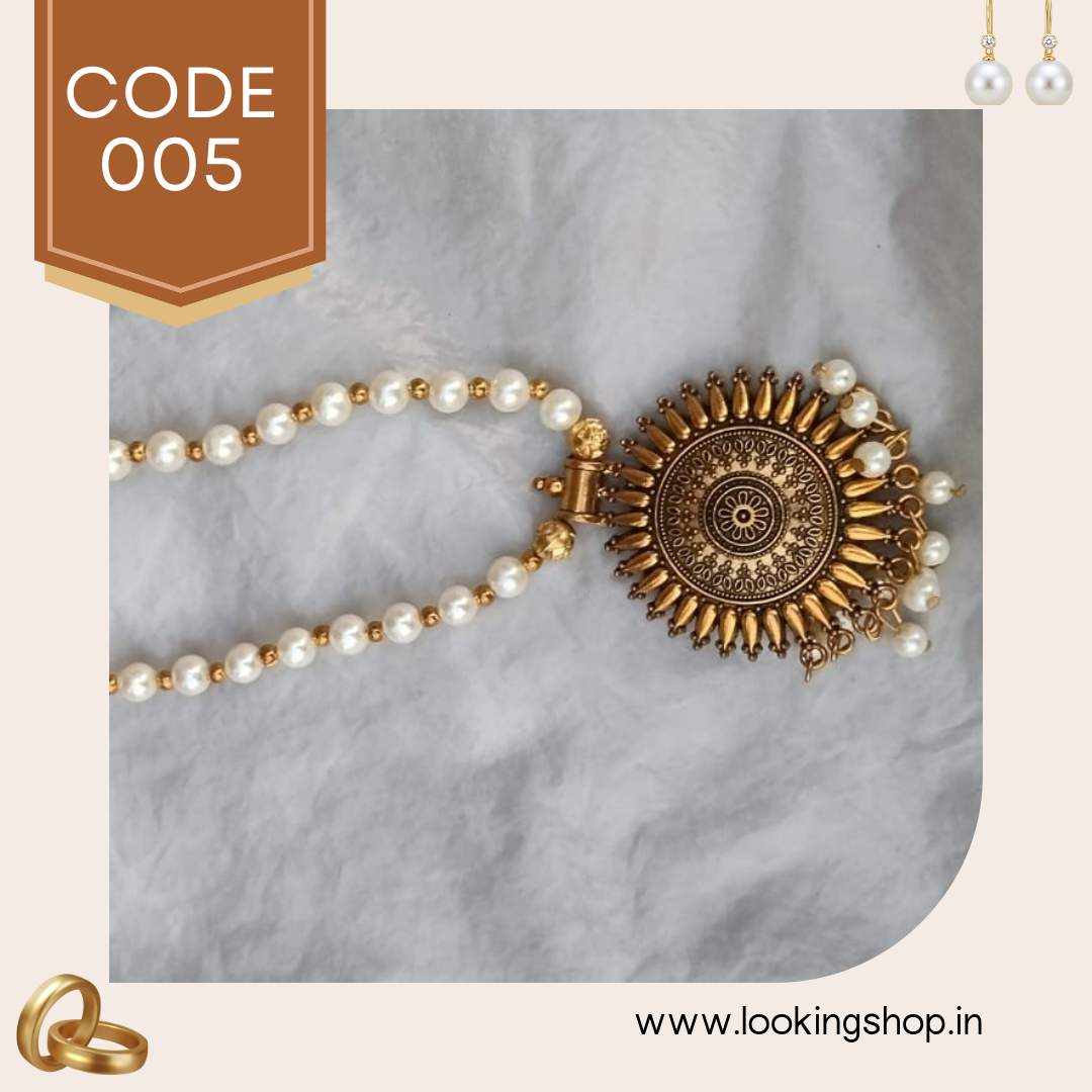 This handmade antique gold-tone pearl necklace is a stunning piece of traditional Indian jewelry designed for women who love elegance with a touch of heritage. The pendant features intricate temple-style carvings with a circular sun-inspired motif, symbolizing prosperity and positivity.