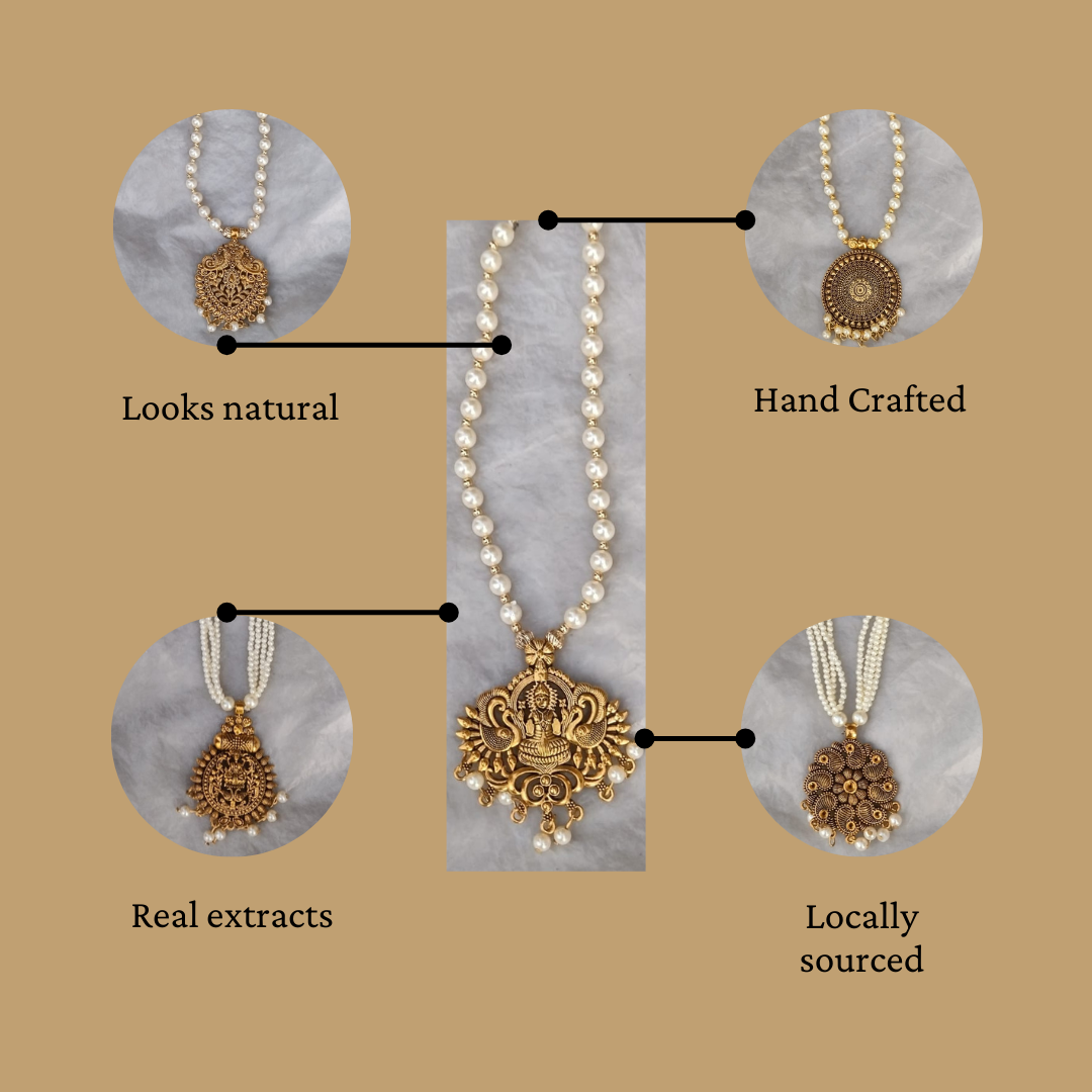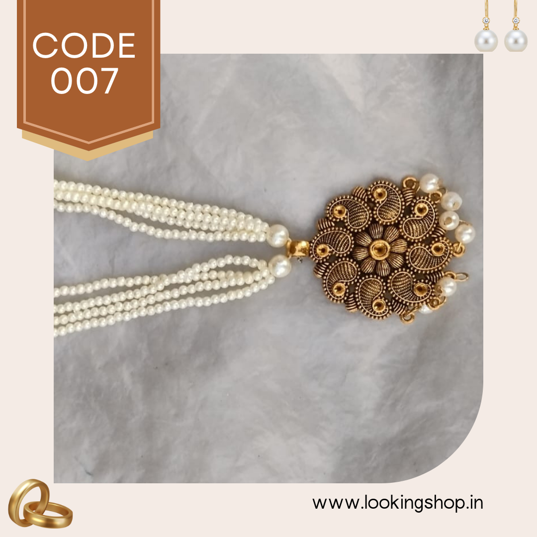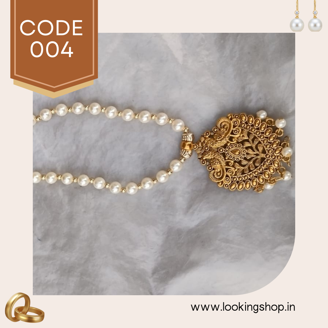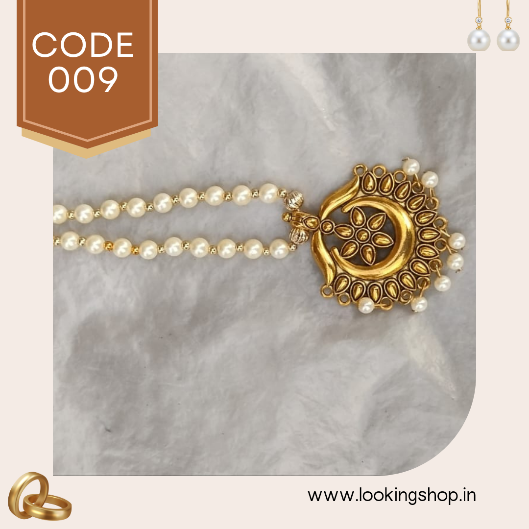 This handmade antique gold-tone pearl necklace is a stunning piece of traditional Indian jewelry designed for women who love elegance with a touch of heritage. The pendant features intricate temple-style carvings with a circular sun-inspired motif, symbolizing prosperity and positivity.