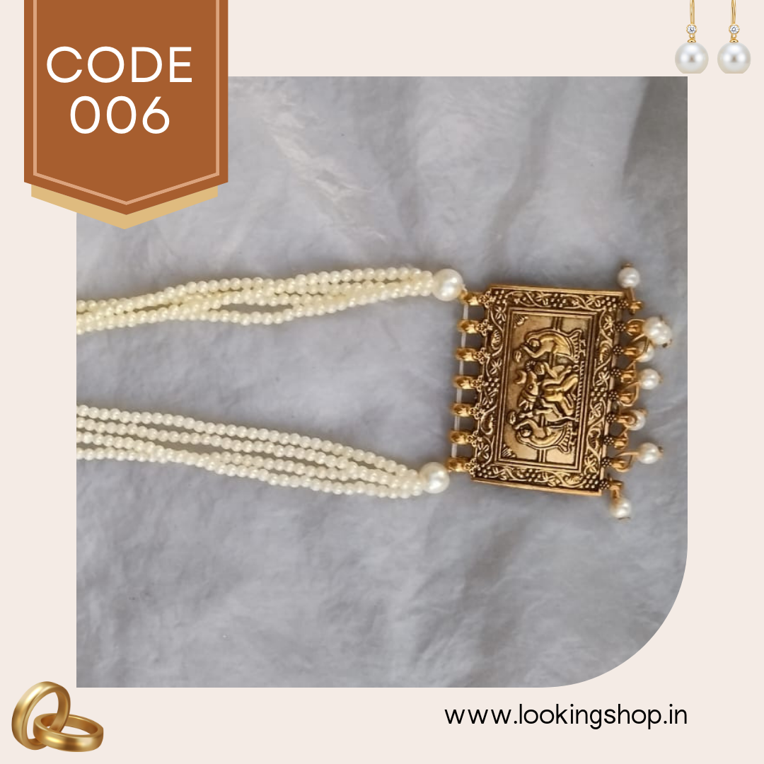 The necklace is beautifully complemented by a row of glossy pearl beads, giving it a rich and timeless appeal. The lightweight design makes it comfortable for all-day wear, whether for weddings, festive events, or everyday ethnic outfits.